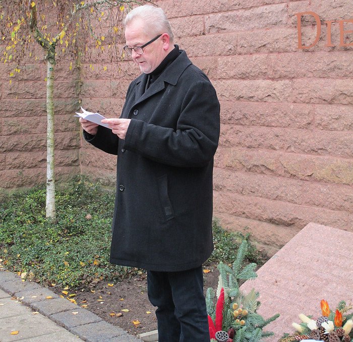 Herr Wolfgang Koenen hielt eine kurze Ansprache, in der er auf den 1. Weltkrieg ein ging, in dem zum ersten Mal chemische Waffen eingesetzt wurden. Des weiteren erinnerte er an die Bücherverbrennung, bei der Erich Kästner, unerkannt, die Verbrennung seiner eigenen Bücher mit ansehen musste, sowie an die Verfolgung und Ermordung der vielen Juden. In seiner Rede gedachte er auch der KZ-Häftlinge, die in der Malzfabrik und der Kyffhäuserhütte in Artern an Krankheit und Hunger starben.