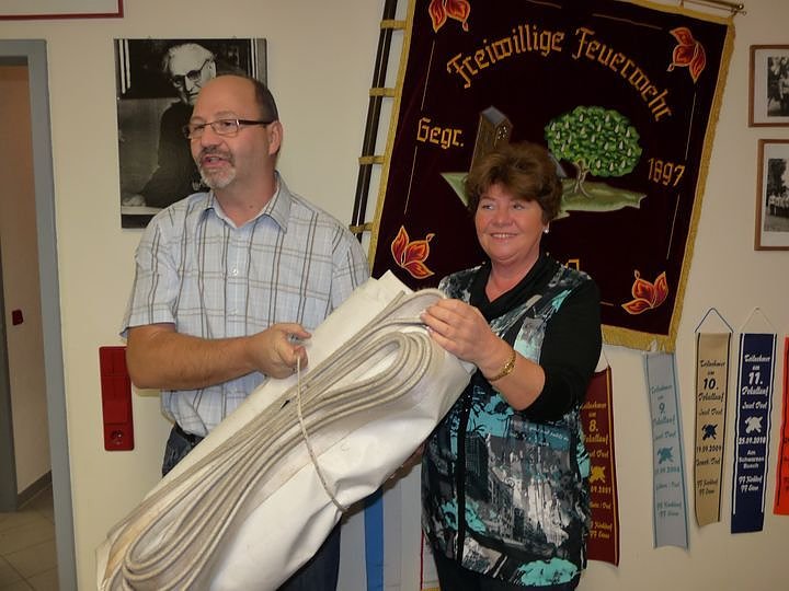 Wehrleiter Matthias Sickel dankte abschließend der Firma Kirchner Schwimmbadtechnik Sondershausen, hier vertreten durch Frau Kirchner. Das Vereins- und Feuerwehrzelt hatte leider Löcher bekommen. Die Firma führte die Schweißarbeiten im Werte von rund 375 Euro kostenlos durch.