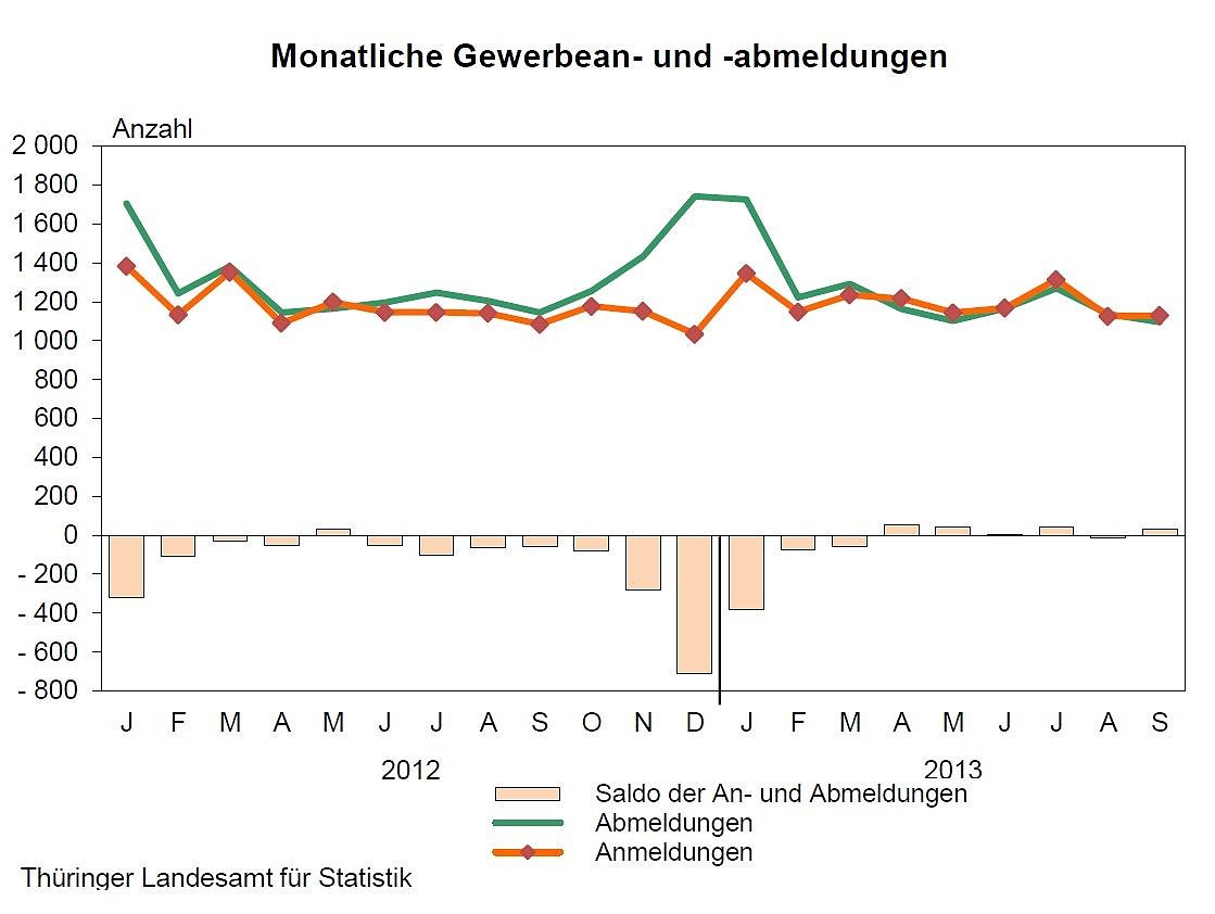 In Thüringen kamen von Januar bis September 2013 auf 10 000 Einwohner 50 Gewerbeanmeldungen und 51 Gewerbeabmeldungen. Regional betrachtet, gab es jedoch erhebliche Unterschiede. Die meisten Gewerbeanmeldungen je 10 000 Einwohner wurden in den Städten Erfurt (73) und Suhl (72) angezeigt und die wenigsten im Altenburger Land (33), sowie im Kyffhäuserkreis und im Wartburgkreis mit jeweils 39 Anmeldungen.
