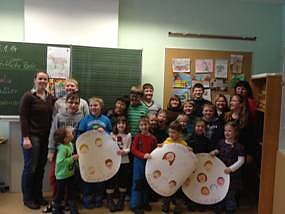 Beim anschließenden gemeinsamen Kaffeetrinken lernten sich beide Kindergruppen erstmals kennen und hatten sich gleich viel zu erzählen. Die im Vorfeld selbst gemalten Porträts wurden danach zu 3 großen Lachgesichtern aufgeklebt, die nun den Gruppen- bzw. Klassenraum der Kinder schmücken. Das 3. Bild schenkten sie Frau Biedermann, die als Vertreterin der Stadt an dieser Veranstaltung teilnahm.