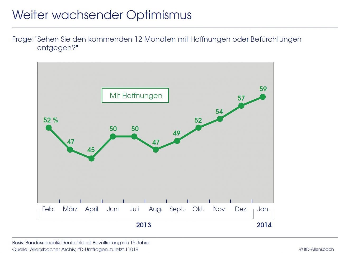 Inzwischen blicken so viele Bundesbürger den kommenden zwölf Monaten mit Zuversicht entgegen wie selten zuvor seit der Wiedervereinigung.