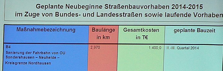 Die Maßnahme wird im Zeitraum II / III Quartal durchgeführt werden, wie der Amtsleiter des Straßenbauamtes Nordthüringen, Franz Rohmund, gestern informierte.