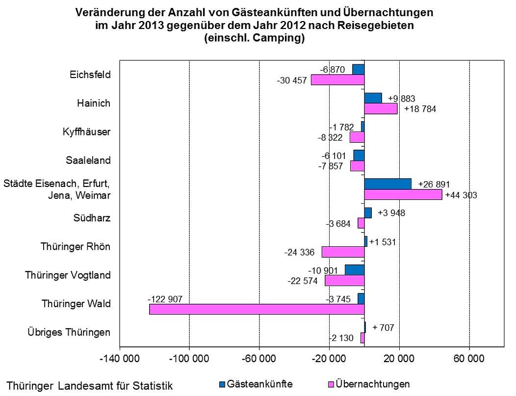 Spürbare Verluste waren hingegen in den Reisegebieten Eichsfeld, Kyffhäuser, Saaleland, Thüringer Vogtland und Thüringer Wald zu verzeichnen, wobei insbesondere die Rückgänge der Übernach-tungszahlen im Thüringer Wald (-123.000) und die Rückgänge der Gästeankünfte im Eichsfeld (-7.000), im Saaleland (-6.000) und im Thüringer Vogtland (-11.000) einen prägenden Einfluss auf das Thüringer Gesamtergebnis des Jahres 2013 hatten.