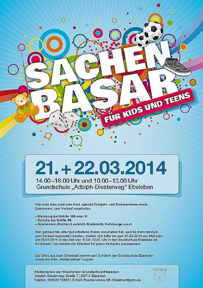 Am 21.03.2014 von 14 bis 18 Uhr und am 22.03.2014 von 10 bis 13 Uhr findet wieder der Sachen-Basar des Fördervereins der Grundschule Ebeleben statt. Verkäufer können sich noch bis zum 07.03. per Email oder persönlich am 08.03. in der Zeit von 10 bis 12 Uhr in der Grundschule in Ebeleben anmelden.