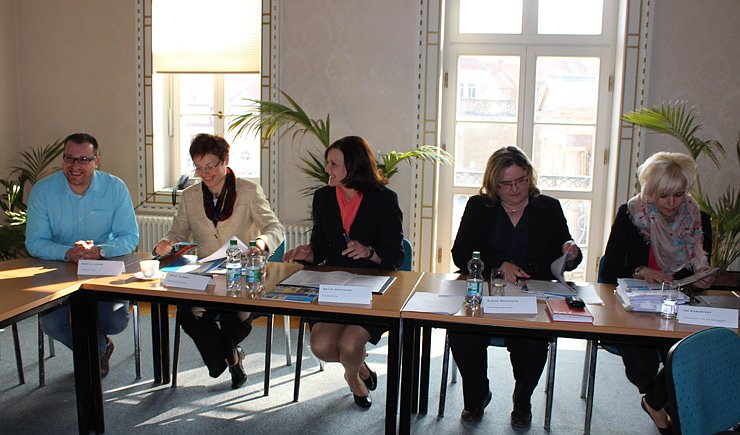An der Spitze dabei Thüringens Sozialministerin Heike Taubert (li.) und Landrätin Antje Hochwind.(SPD), flankiert von einem Teil des Teams, welche die Broschüre erarbeitet haben, Sabine Bräunicke und Ina Karnstedt )Jugend und Sozialamt Kyffhäuserkreis, auf der einen Seite und Martin Ludwig (Fa. maniax at work) auf der anderen Seite.