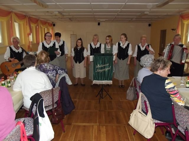 Nun folgte die erste von Christa Groß angekündigte Überraschung. Die Bebraer Singvögel mit 10 Damen und Mädchen präsentierten uns eine Stunde lang ein wunderbares Programm mit Gedichten, Liedern, Melodien, Sketchen und Aufführungen mit verschiedenen Kostümen. Unter anderem hatten sich 2 Mädchen als Schmetterling und Marienkäfer mit Flügeln ausgestattet und erzählten von ihrem tierischen Alltag.