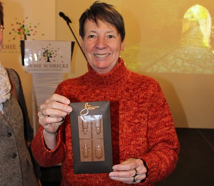 Was macht man, wenn die Wildkatze als Wappentier vergeben ist (Hainich), auch wenn Sie in der "Hohen Schrecke" sehr präsent ist? Man sucht sich ein anderes markantes Tier der Region. Nun ja, Totholzkäfer sind eigentlich schwer zu verschenken. Wenn sie aus Schokolade sind und auch noch in Nachbarschaft der "Hohen Schrecke" in Oldisleben (Goethetaler Manufaktur), dann wird das gern genommen.