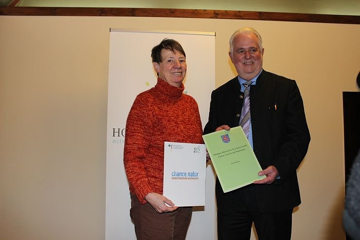 Neben Bundesministerin für Umwelt, Naturschutz, Bau und Reaktorsicherheit, Dr. Barbara Hendricks nahmen an anschließenden Gesprächsrunde und der Fördermittelvergabe auch Prof. Dr. Hubert Weiger, Vorsitzender Bund für Umwelt und Naturschutz,Deutschland, Thüringens Sozialministerin Heike Taubert (SPD), Jürgen Reinholz (CDU) Thüringer Minister für Landwirtschaft, Forsten, Umwelt und Naturschutz (Foto mit Förderbescheid), Uwe Höhn (SPD) Thüringer Minister für Wirtschaft, Arbeit und Technologie, teil.