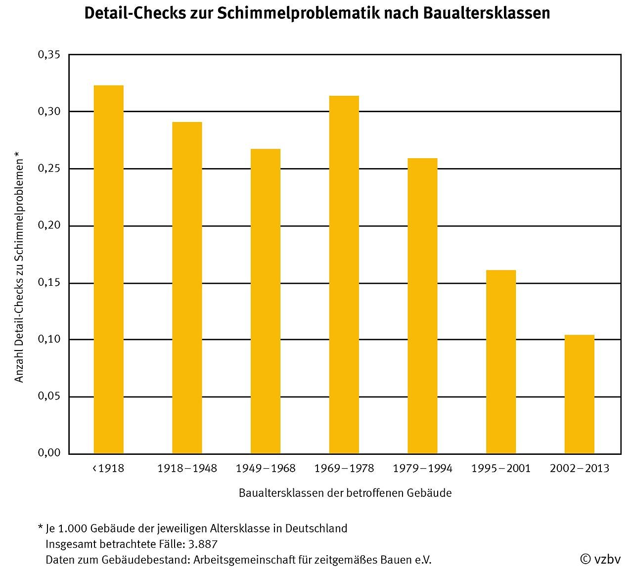 Im Rahmen unserer Detail-Checks besuchen Energieberater Verbraucher mit spezifischen Energiefragen zuhause und beraten sie vor Ort. Schimmelbefall ist dabei häufig Teil des Problems. Angesichts der aktuellen Diskussion über die Wärmedämmung haben wir ausgewertet, welche Baualtersklassen besonders vom Schimmel betroffen sind – die gut gedämmten Neubauten oder die älteren, tendenziell schlechter gedämmten Häuser, erklärt Mentzel die Erhebung.