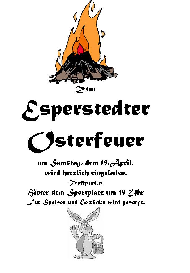 Am Samstag, dem 19.April, wird herzlich zum Osterfeuer eingeladen. Treffpunkt: