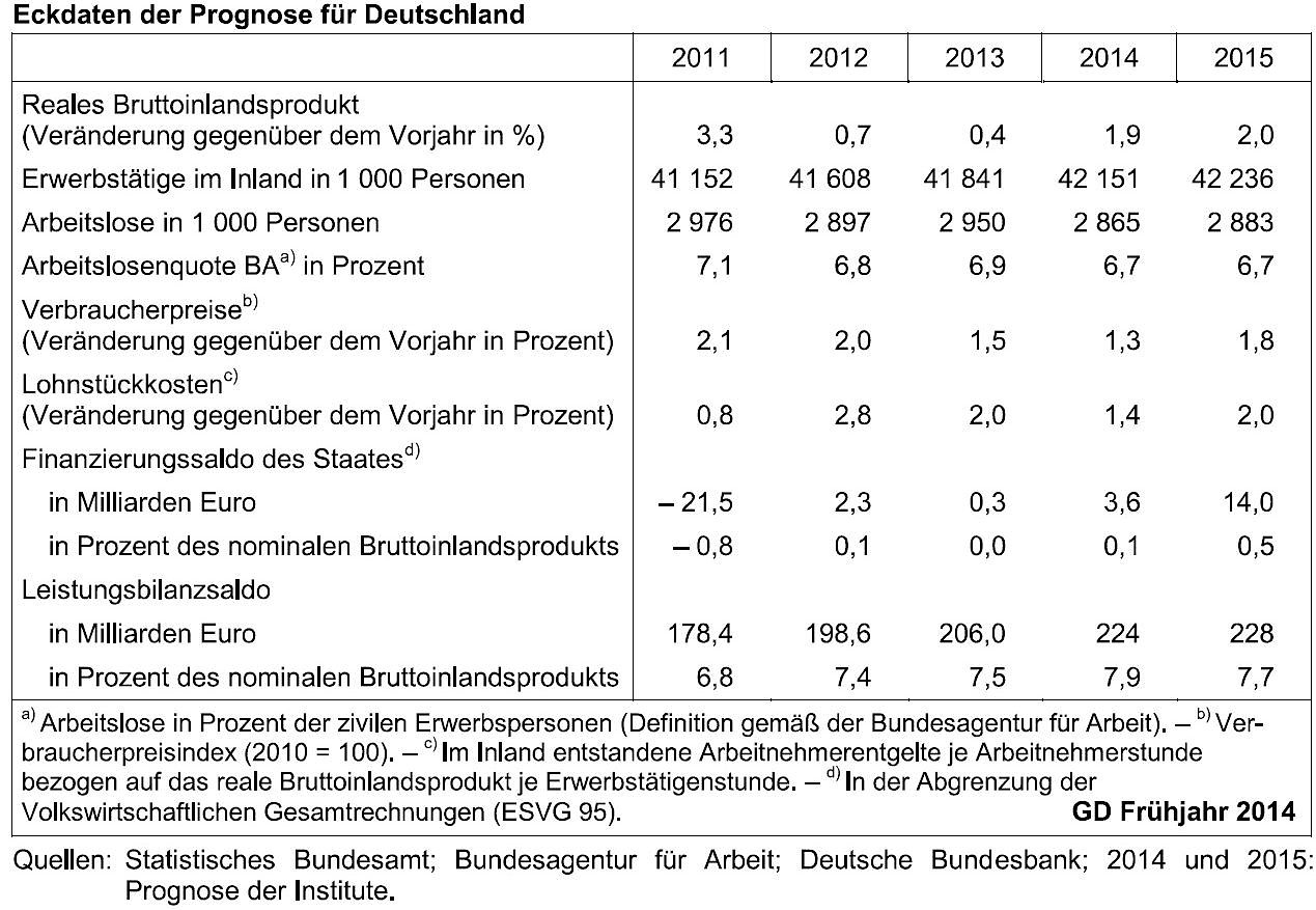 Die deutsche Wirtschaft befindet sich im Frühjahr 2014 im Aufschwung. Das Bruttoinlandsprodukt wird in diesem Jahr voraussichtlich um 1,9 Prozent steigen. Das 68-Prozent-Prognoseintervall reicht dabei von 1,2 Prozent bis 2,6 Prozent. Treibende Kraft ist die Binnennachfrage...