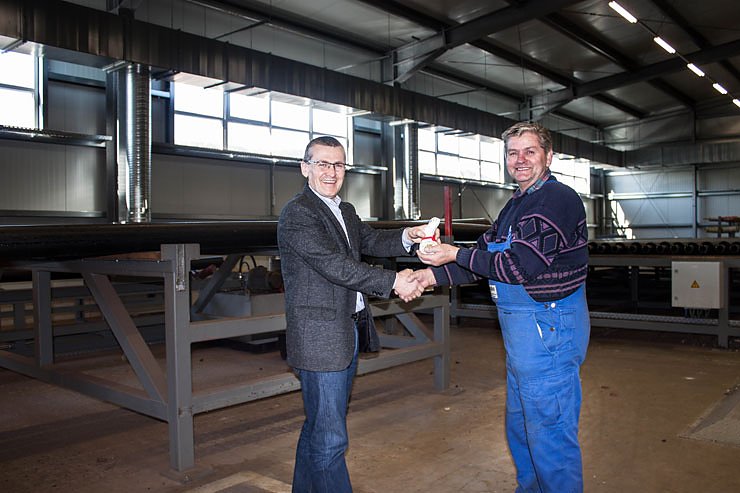 Im Bild Rene Tiede (Betriebsleiter), bei der Verteilung des kleinen Dankeschöns an Mitarbeiter Horst Rudloff.