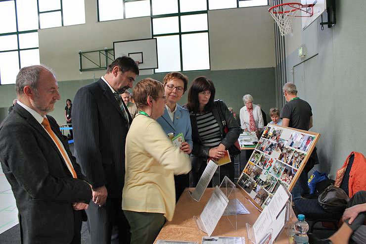 Die Schirmherrin Heike Taubert ließ es sich nicht nehmen, allen Ständen einen intensiven Besuch zu gewähren, und sich über die Angebote informieren zu lassen, wie hier von Heidi Meister beim Behindertenverband des Kyffhäuserkreieses. Mit dabei u.a. auch Landtagsmitglied Manfred Scherer (CDU). An dieser Stelle des Rundganges hatte sich aus Termingründen der erste Beigeordnete des Landkreises, Holger Häßler aus Termingründen bereits ausklinken müssen. Für den Rundgang fit gemacht hatten sich in einer Aufwärmrunde Taubert und Kraffzick.