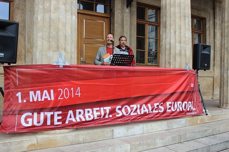 Unter dem Motto: Gute Arbeit. Soziales Europa. hatte der Vorsitzende des Kreisverbandes des DGB Kyffhäuserkreis, Reiner Sörgel die Kundgebung am Tag der Arbeit auf dem Marktplatzplatz in Sondershausen eröffnet. Hauptredner war Matthias Altmann von der Eisenbahn - und Verkehrsgewerkschaft EVG.