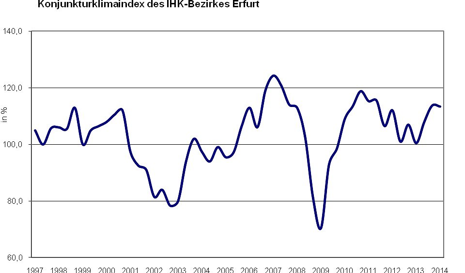 Mehr Aufträge und gut ausgelastete Kapazitäten sorgen für eine positive Ertragslage. Zwar kann das bisherige Tempo des Aufschwungs nicht ganz beibehalten werden, Grund zur Sorge besteht jedoch nicht. Im Ergebnis der aktuellen Konjunkturumfrage der Industrie- und Handelskammer (IHK) Erfurt unter rund 800 Unternehmen in Nord- und Mittelthüringen sinkt der Geschäftsklimaindex nur geringfügig um einen Prozentpunkt im Vergleich zur vorhergehenden Analyse und bleibt mit 113 von 200 möglichen Punkten auf hohem Niveau.