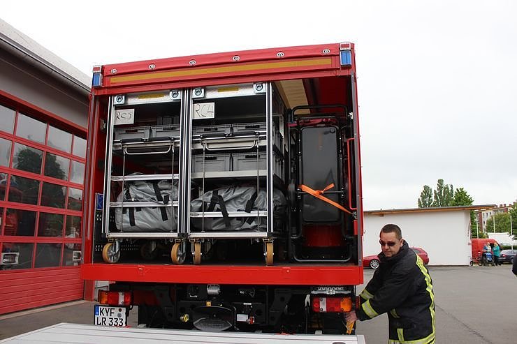 Auf dem Fahrzeug ist die komplette Ausstattung verlastet, die für den Aufbau und den Betrieb eines Dekontaminationsplatzes benötigt wird.