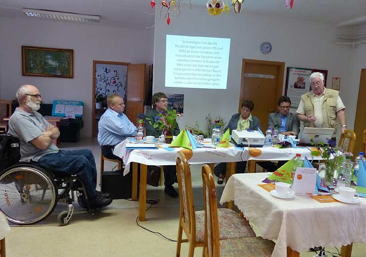 Einstimmung in die Thematik zeigte eine Präsentation mit treffender Umschreibung, dass das Thema Umgang mit den Menschen mit Behinderungen im Bund wie in unserem Bundesland schon lange, aber nur halbherzig, erörtert wird. Von der Erklärung von Barcelona bis zur UN-Meschenrechtskonvention haben sich die beteiligten Länder (auch Deutschland) kokrete soziale Verpflichtungen übernommen. U. a. sollen die von Behinderung Betroffenen so unterstützt werden, dass sie so lange wie möglich in ihrer vertrauten Wohnung verbleiben können und nicht in ein Pflegeeinrichtung eingewiesen werden müssen! Ein sehr edles Ziel, das aber auf Grund der Finanznot der kommunalen Verwaltungen von Anfang an Illusion blieb.