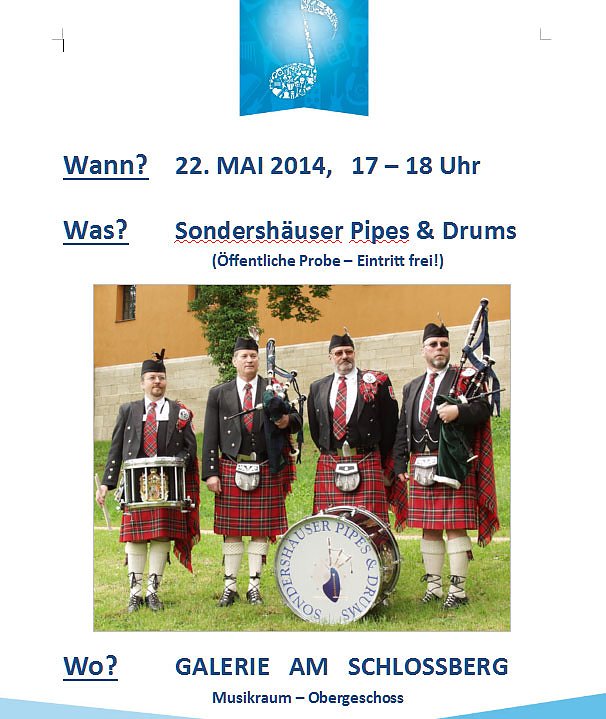 Die Sondershäuser Pipes & Drums musizieren anlässlich einer öffentlichen Schau- und Hörprobe am 22. Mai 2014, in der Zeit von 17 – 18 Uhr, im Musikraum in der GALERIE AM SCHLOSSBERG.