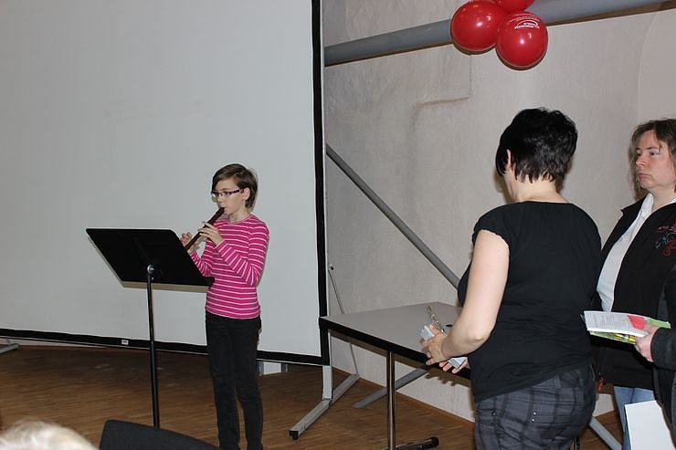 Colleen von der privaten Musikschule Notenland erfreute mit ihrem Flötenspiel und ausgerechnet die ältere Generation konnte nicht mal fünf Minuten den "Schnabel" halten, dass selbst Bürgermeister Joachim Kreyer musste zwischendurch zur Ordnung rufen. Aber beim zweiten Vortrag mit der Querflöte herrschte Ruhe.