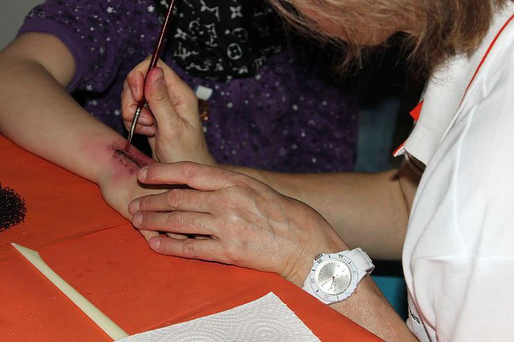 Recht blutig ging es beim Schminken zu. Aber zum Glück nur mit Farbe. Die Kinder sollen aber ein Gespür bekommen, wie Wunden im Ernstfall aussehen könnten. Da ist es lehrreich, dass vorher zu sehen.