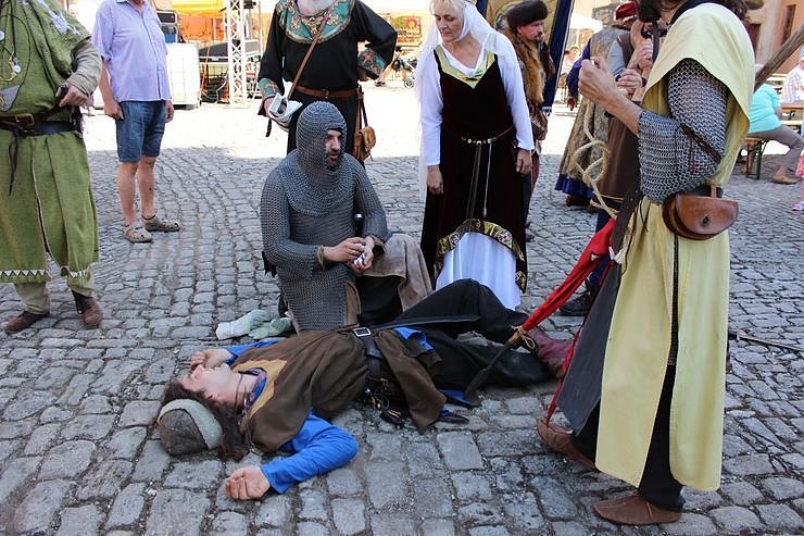 Erwischt. Der Ohnmächtige war vom Verein für lebendiges Mittelalter und auch der Räuber gehörte zur Truppe. Der Verein startete heute den Handwerkermarkt am Vormittag mit seiner Aufführung.