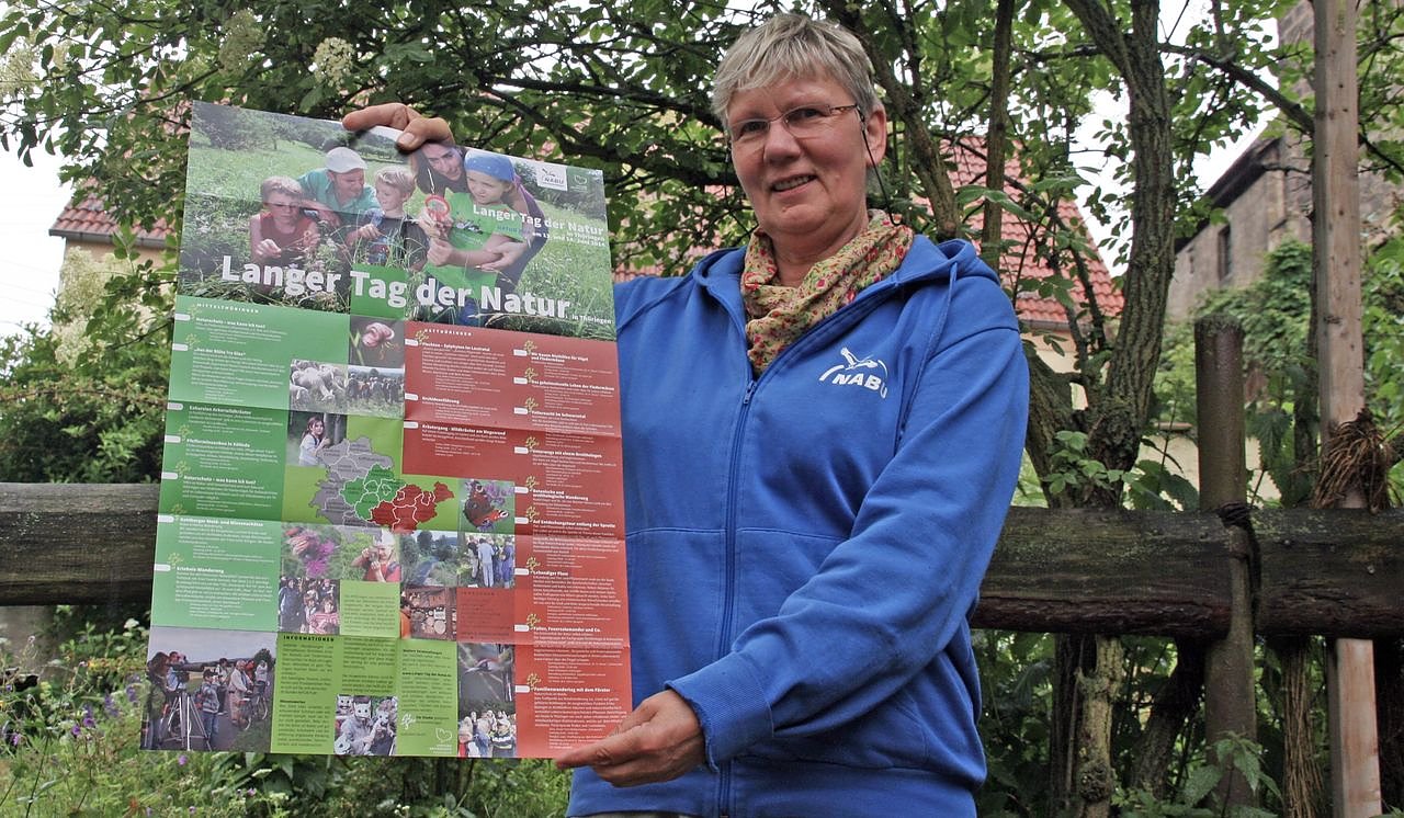 Autor: redGisela Stang vom NABU Thüringen zeigt das neue Faltplakat zum "Langen Tag der Natur"