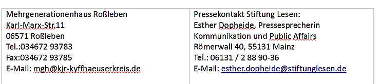 Am 17.06.2014 um 15:00 Uhr eröffnet die Stadtbibliothek und das Mehrgenerationenhaus Roßleben gemeinsam mit der Stiftung Lesen einen neuen Leseclub im Mehrgenerationenhaus in Roßleben.