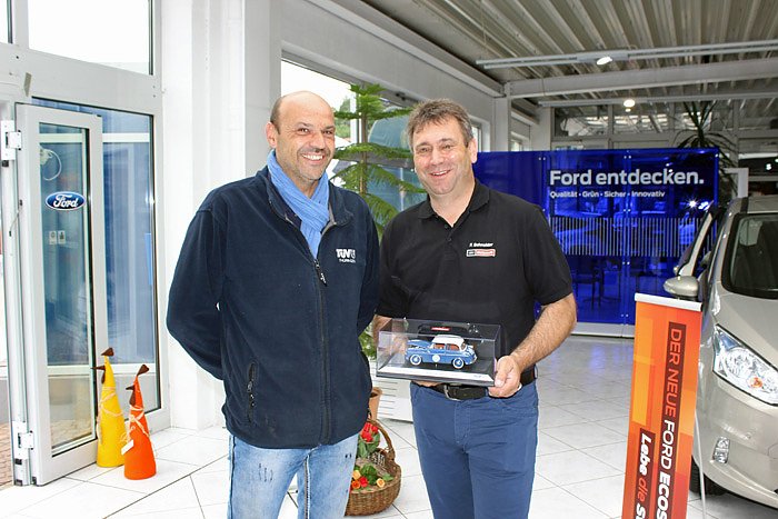 Auf unsere Gäste warten zahlreiche Attraktionen, u.a. die Möglichkeit zur Probefahrt mit dem neuen Elektro-Focus, zahlreiche Modelle, vom Ka bis zum Transit Tourneo, Spiel und Spaß für Kinder, Torwandschießen und eine Tombola zu Gunsten der DKMS, so Geschäftsführer Frank Schneider (re), gegenüber kn während er zahlreich Glückwünsche der Gäste erhält, die nicht alle namentlich genannt werden konnten.