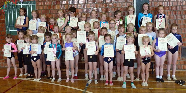 43 Turner standen am Sonnabend, den 28.06.14 in der Turnhalle um ihre Kyffhäuser Kreis- Kinderjugendspiele zu begehen. Geturnt wurden Pflichtübungen an den Geräten:Boden, Sprung, Schwebebalken und Reck bzw. Stufenbarren (unterer Holm) in unterschiedlichen Altersklassen. Im Kyffhäuserkreis wird noch in Artern geturnt, so waren sie auch unsere Gäste zu diesem Wettkampf.. Sie hatten einen weiten Anreiseweg.