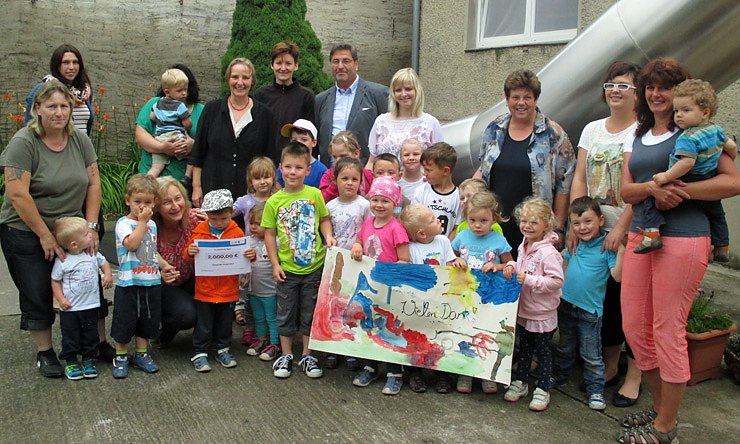 Besonders freuten sich der 1.Beigeordnete Raimund Scheja, die Vorsitzende des Fördervereins Karina Feige u.deren Mitglieder, sowie die Leiterin der Kita Elke Roßmann über den Scheck, welcher am Dienstag, dem 8.Juli 2014 persönlich durch Frau Staatssekretärin Hildegund Neubert, sowie in Anwesenheit von Landtagsmitglied Gudrun Holbe (CDU) , im Kindergarten übergeben wurde.
