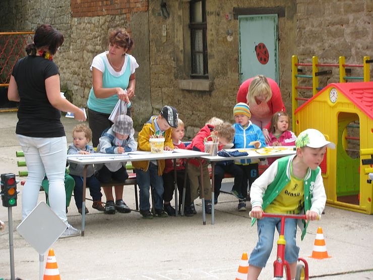 An mehreren Stationen zeigten die Kinder ihr erworbenes Verkehrswissen, sie absolvierten einen Roller- bzw. Laufradparcours, der mit verschiedenen Verkehrszeichen und Slalomfahrten durch Pylonen ausgestattet war.