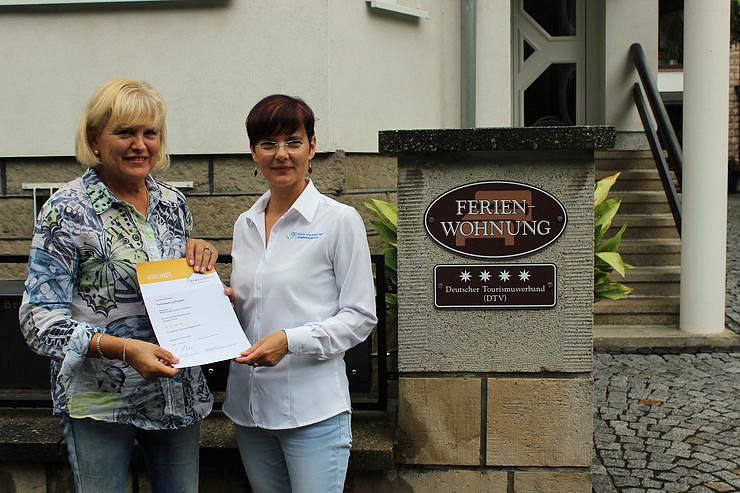 So nahm es kein Wunder, dass man bereits im Juli 2011 die Klassifizierung mit Vier-Sternen für Ferienwohnungen des Deutschen Tourismusverbandes DTV erhielt. Die Leiterin der Touristformation Sondershausen, Angela Böhme, übergab heute die Fortschreibung der Klassifizierung als 4-Sterne- Ferienwohnung an Karla Päckert (li.), denn diese Klassifizierung muss alle drei Jahre verteidigt werden.