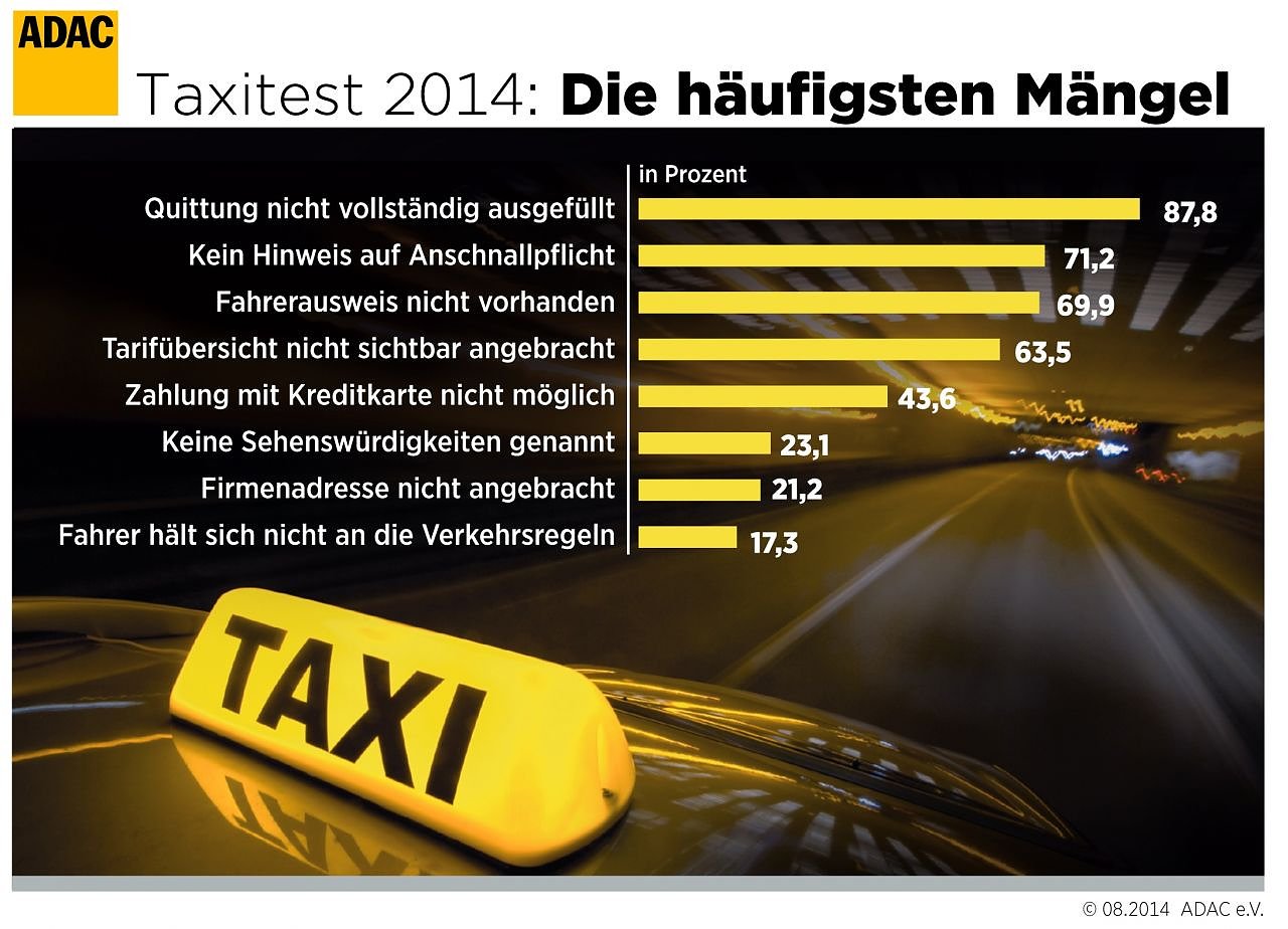 Die häufigsten Mängel waren fehlende Hinweise auf Fahrpreistarife, Fahrerlaubnis und Anschnallpflicht. In fast 90 Prozent aller Fälle waren Quittungen unvollständig ausgefüllt. Zudem registrierten die Tester bei 16 Fahrten unnötige Umwege sowie vier Fahrtverweigerungen.