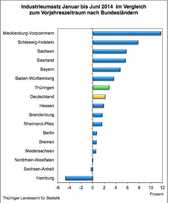 Der Thüringer Absatz auf dem inländischen Markt stieg von Januar bis Juni 2014 gegenüber dem Vorjahreszeitraum um 2,3 Prozent. Während in den neuen Bundesländern 2,6 Prozent mehr Umsatz realisiert wurden, wuchs der Inlandsumsatz im Bundesdurchschnitt nur um 1,2 Prozent. Thüringen verbesserte sich damit im Ländervergleich auf den 7. Platz.