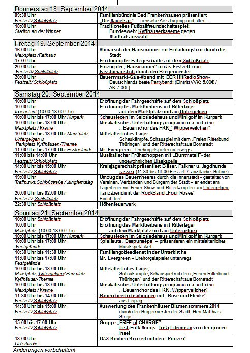 Langsam rückt er näher, der Bauernmarkt in Bad Frankenhausen. Für Sie hat kn mal in das Veranstaltungsprogramm des Frankenhäuser Bauernmarkts geschaut, der vom vom 18. bis 21. September 2014 stattfindet...