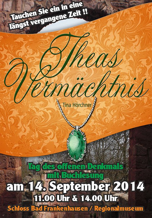 Den Tag des offenen Denkmals 2014 umrahmen wir in Schloss Frankenhausen mit einem kleinen Programm. Darin enthalten auch eine Buchlesung mit der Sondershäuser Autorin Tina Hörchner. Ihr historischer Roman Theas Vermächtnis führt uns in die Kyffhäuserregion des Hochmittelalters. Hier das ganze Programm...
