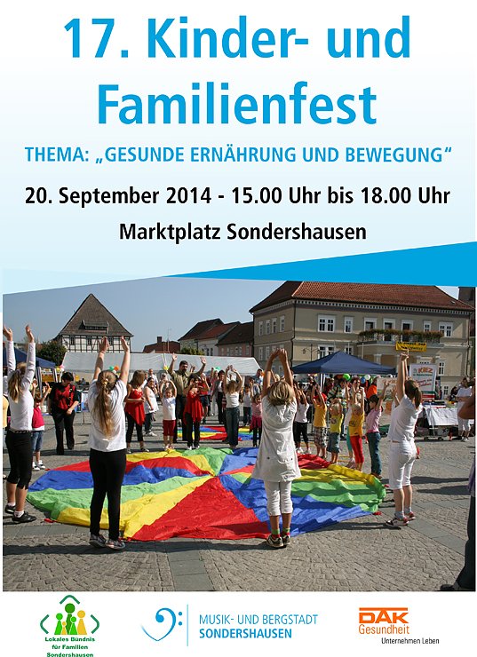 Autor: khhAm 20. September 2014 von 15.00 bis 18.00 Uhr veranstalten die Stadt Sondershausen und das Lokale Bündnis für Familie auf dem Marktplatz und dem angrenzenden Parkplatz "Schwan" das schon zur Tradition gewordene Kinder- und Familienfest.