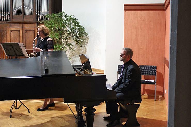 Für die musikalische Umrahmung sorgten Sonnwill Zscheckel (Altsaxophon) und Steffen Braune (Klavier). Die dezente Musik passte sich gut dem Thema an, schon mit dem Beginn "Sag mir wo die Blumen sind.