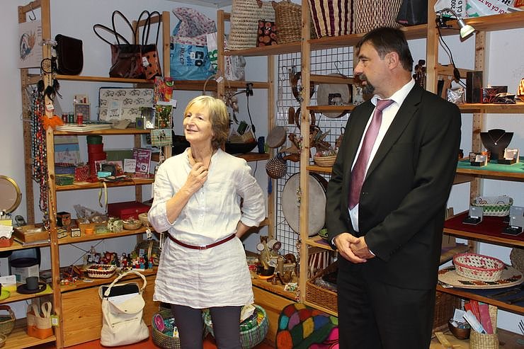 Vereinsvorsitzende Anette Rudolph , hier mit Sondershausens Bürgermeister Joachim Kreyer, bei der Eröffnung der Ausstellung. Eigentlich verkauft der Verein Eine Faire Welt "nur" aber als die Bitte herangetragen wurde, eine Sammlung von Bildern auszustellen und die Vermittlung zu übernehmen, falls wenn sich Interessenten melden, war man voll dabei, so gegenüber kn.