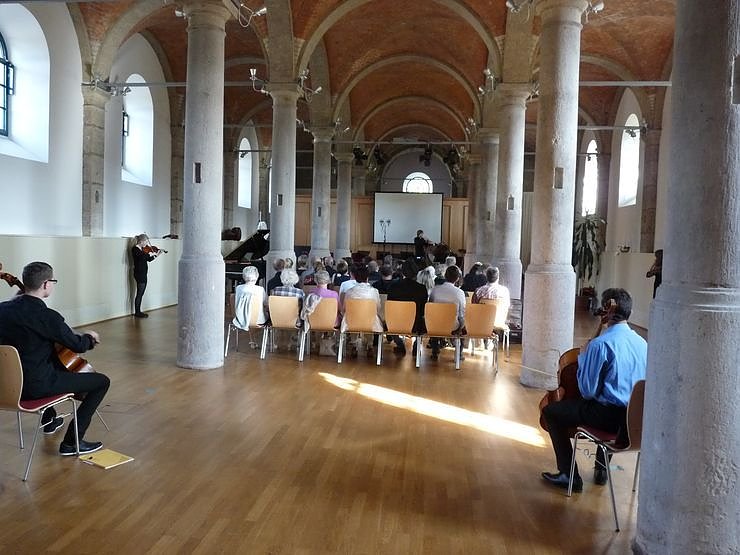 Schon der Beginn des Abschlusskonzertes versetzte in erstaunen. Das Landesjugendensemble für Neue Musik Thüringen begann das Abschlusskonzert in der Art, dass die jungen Musiker rund um das Publikum verteilt waren.