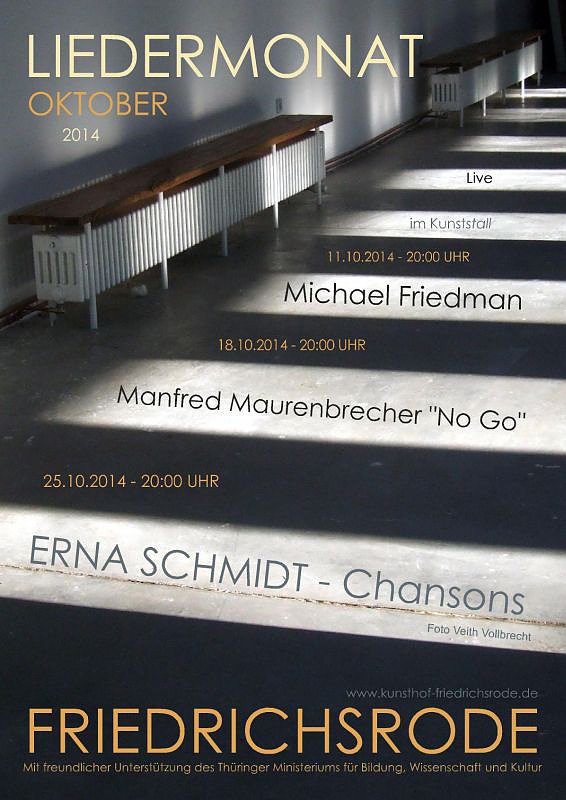 Angesagt hat sich ein hochkarätiger Musiker aus Kanada. Michael Friedman, …ein hervorragender Sänger und vollendeter Musiker’, wie die Presse euphorisch schreibt, ist in erster Linie Singer/Songwriter.Am 11.10.2014 gastiert er ab 20:00 Uhr im KUNSTHOF Friedrichsrode...