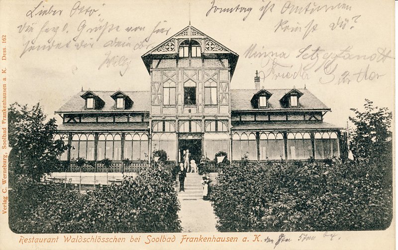 Versehen mit reichlich Bildmaterial wenden wir uns dem Waldschlößchen nördlich von Bad Frankenhausen im Kyffhäusergebirge, dem Bergschlößchen südlich der Stadt in der Hain- und Windleite, der Gastwirtschaft an der Ruine Arnsburg bei Seega und der Gastwirtschaft in der oberen der beiden Sachsenburgen zu.