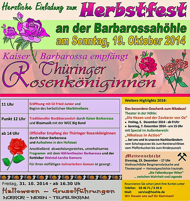 Am Samstag wird es im Freizeitzentrum Artern ein Herbstfest geben und am Sonntag an der Barbarossahöhle in Rottleben...
