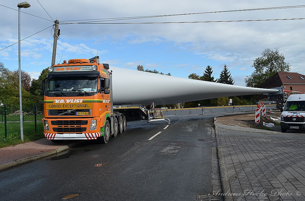 Auf der B4 war der Schwerlasttransport aus Richtung Erfurt gekommen. Es wurden heute 2 Windradflügel mit einer Länge von 55 m je Stück geliefert.