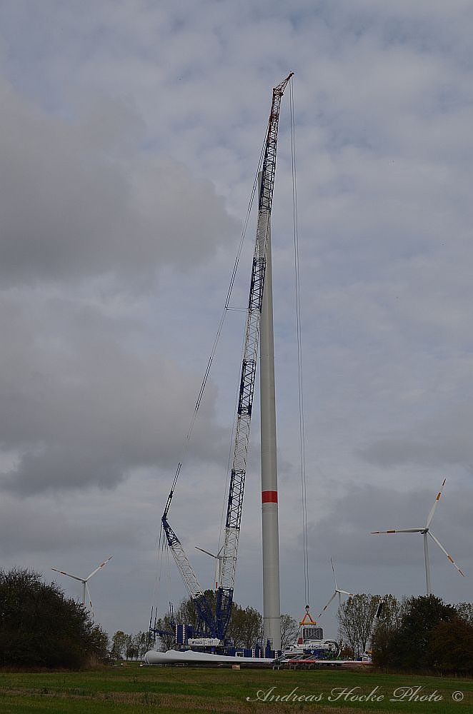 Diese Flügel sind zwar bestimmt für den Windpark Kutzleben, jedoch ist die Anfahrt dorthin nur über Greußen möglich. Dort werden vier Windkraftanlagen errichtet mit einer Gesamthöhe von 196 Meter, das heißt vom Boden bis zur Flügelspitze. Der Kran auf dem Bild oben ist rund 150 Meter hoch und schon von weitem zu sehen.