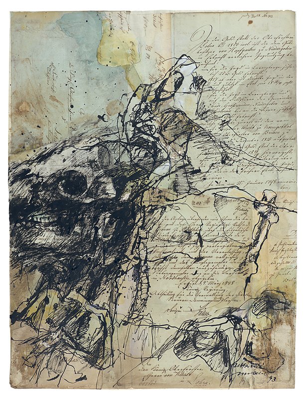 Chinatusche und Rohrfeder, teilweise aquarelliert, auf historischen Schriften, montiert auf Zeichenkarton, 64,1 x 49,0 cm