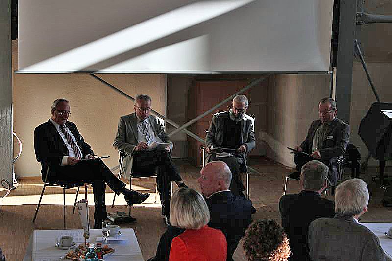 In einer Podiumsdiskussionsrunde blickten anschließend Karl-Heinz Langhorst (Moderator), Reinhard Valentin, Thomas Weinrich und Claus Pocklitz (v.l.n.r.) aus ihrer sicht auf die Wendezeit zurück.