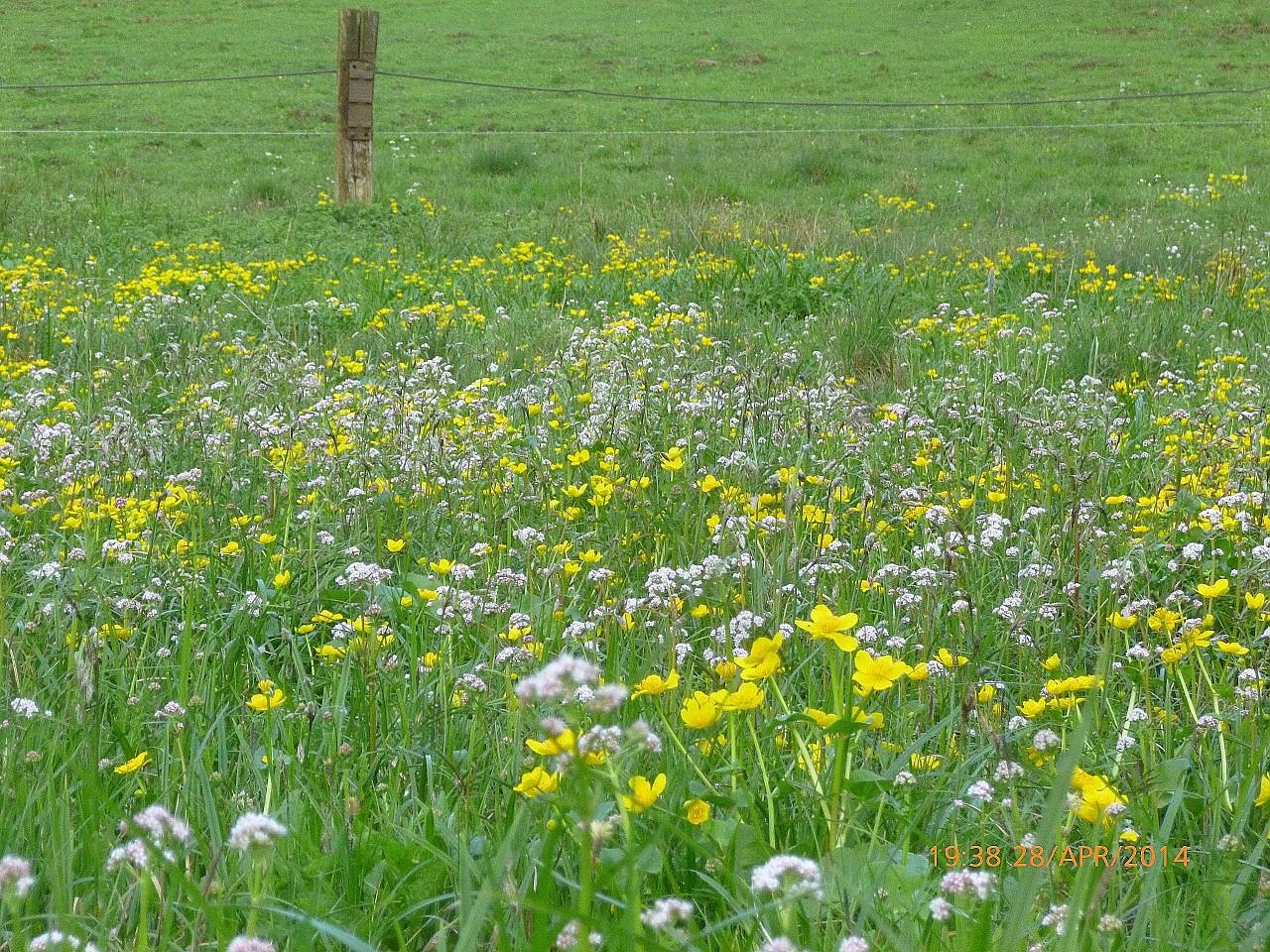Im Rahmen des Projekts gepflegte nährstoffärmere Feuchtwiese im NSG Rüdigsdorfer Schweiz: Artenreiche Feuchtwiesen gehören zu den stark gefährdeten und vom Aussterben bedrohten Biotoptypen Thüringens. Hier wird das bunte Bild von der Sumpf-Dotterblume, dem Kleinen Baldrian und dem Schmalblättrigen Wollgras bestimmt.
