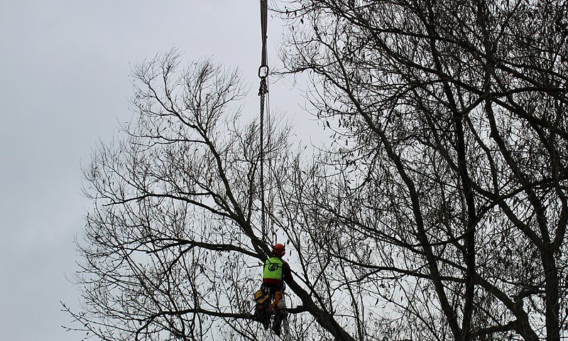 Die beiden Bäume müssen Ast für Ast von einer für solche schwierigen Arbeit autorisierten Firma durchgeführt werden. Es ist die Firma Baumpflege Eichsfeld.
