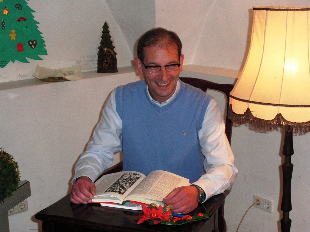 Das Bild zeigt den Apotheker Roland Heller, wie er vor einigen Jahren eine recht amüsante Geschichte gelesen hat.